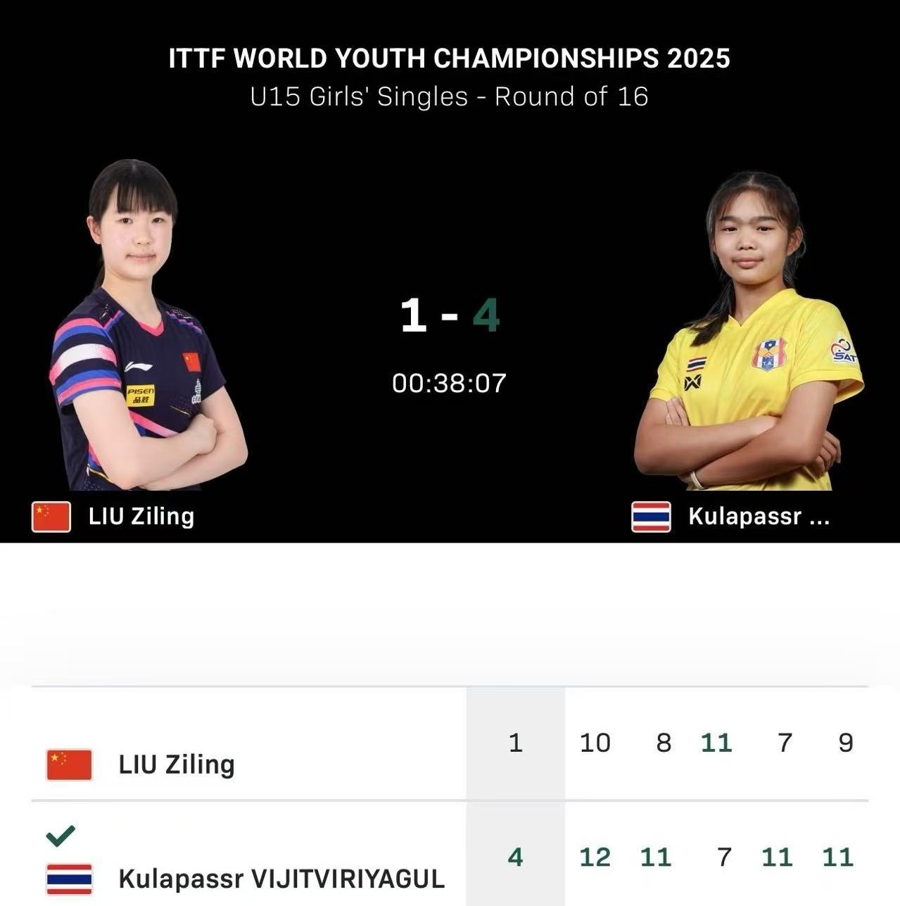 11月28日,2025年世界青年乒乓球锦标赛单打八分之一决赛落幕。14岁的国乒小将刘子菱在U15女单八分之一决赛中,以1比4(10比12、8比11、11比7、7比11、9比11)不敌泰国选手维吉特维里亚古,无缘八强。