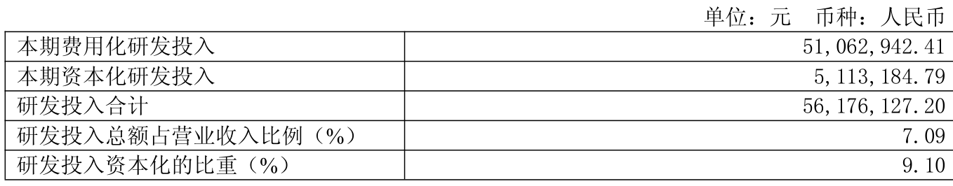 2025年全年,公司研发投入金额为5617.61万元,同比增长7.23%;研发投入占营业收入比例为7.09%,相比上年同期持平。此外,公司全年研发投入资本化率为9.1%。