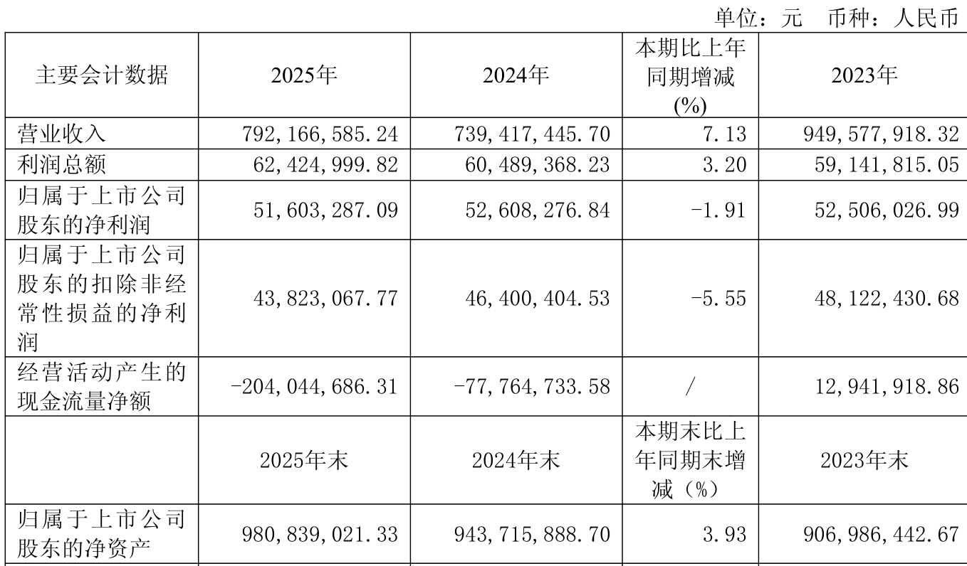 中证智能财讯金自天正(600560)3月27日披露2025年年度报告。2025年,公司实现营业总收入7.92亿元,同比增长7.13%;归母净利润5160.33万元,同比下降1.91%;扣非净利润4382.31万元,同比下降5.55%;经营活动产生的现金流量净额为-2.04亿元,上年同期为-7776.47万元;报告期内,金自天正基本每股收益为0.2307元,加权平均净资产收益率为5.38%。公司2025年度分配预案为:拟向全体股东每10股派现0.712元(含税)。