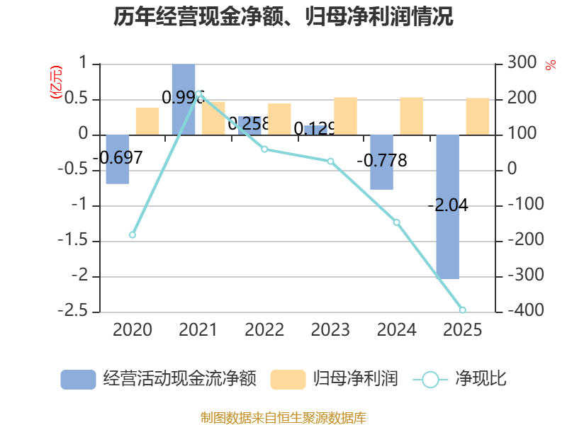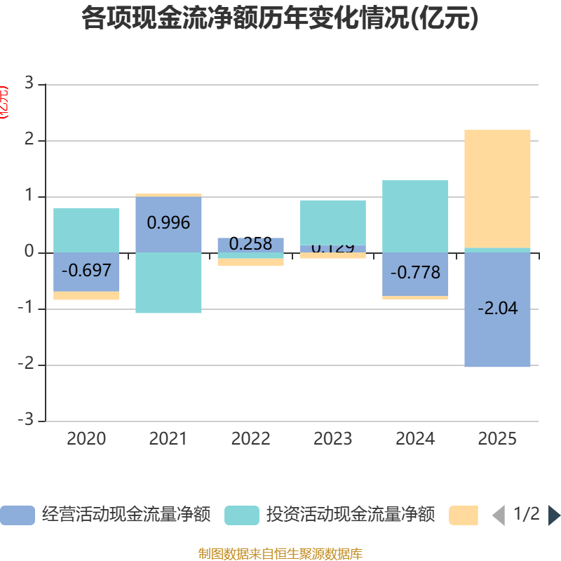 截至2025年,公司经营活动现金流净额为-2.04亿元,同比减少1.26亿元;筹资活动现金流净额2.1亿元,同比增加2.16亿元;投资活动现金流净额840.87万元,上年同期为1.29亿元。