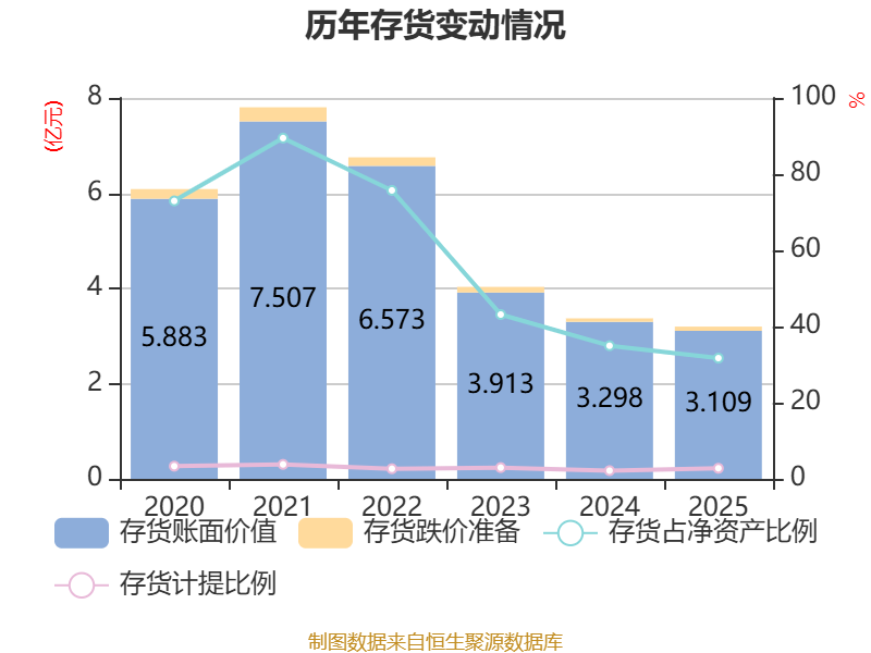 从存货变动来看,截至2025年末,公司存货账面价值为3.11亿元,占净资产的31.7%,较上年末减少1888.18万元。其中,存货跌价准备为887.95万元,计提比例为2.78%。